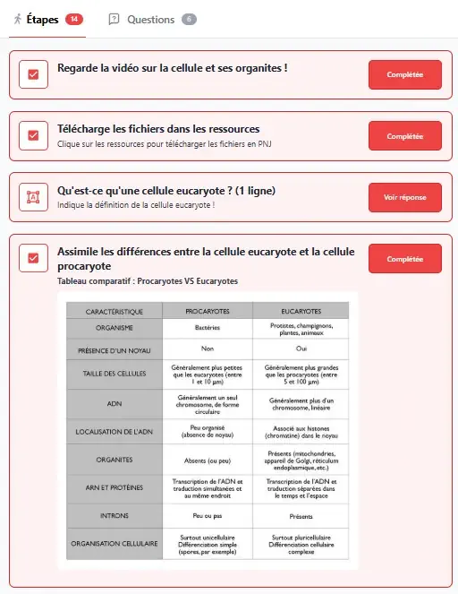 Des étapes avec du contenu dynamique (flashcards, légender, relier, glisser-déposer…) pour apprendre activement et mieux mémoriser.